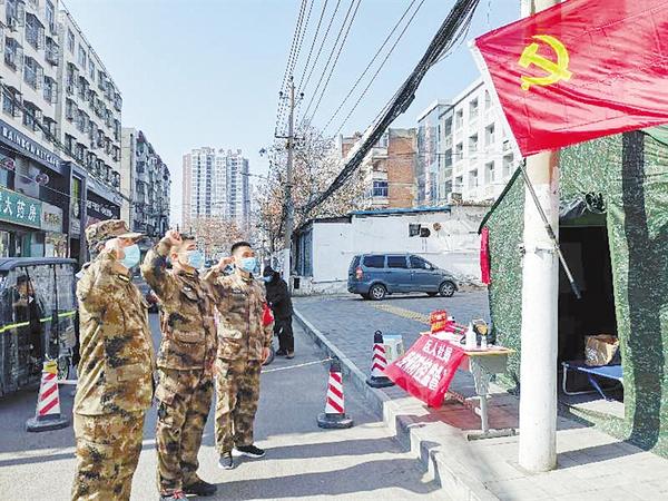 为了让党旗始终飘扬在战“疫”最前线,切实发挥党建引领作用和党支部战斗堡垒作用,川汇区陈州街道办事处党工委充分融合办事处党员干部、分包局委党员干部和党员志愿者的力量,在符合条件的疫情防控卡点成立临时党支部50个,实现了“疫情防控在哪里,党支部就建到哪里”。图为疫情防控卡点的党员干部面对党旗庄严宣誓,不战胜疫情,决不收兵。