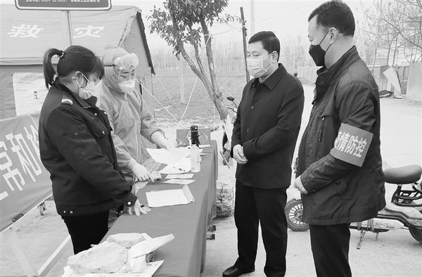 2月15日,郸城县公安局领导班子分别带队,深入乡镇督查疫情防控和春耕工作,慰问坚守一线执勤人员,了解群众生产和外出人员返城务工情况,确保战“疫”必胜、群众正常有序春耕。图为该局领导在宁平镇督查疫情防控检测卡点执勤情况。