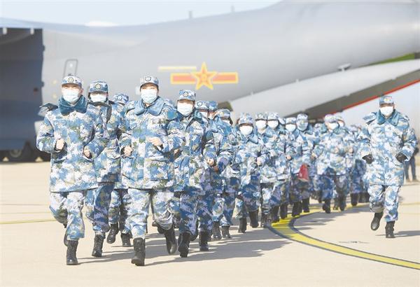 2月17日,刚下飞机的医疗队员列队跑步离开停机坪。按照中央军委命令,2月17日凌晨,空军出动包括国产运-20在内的3型8架运输机第四次向武汉空运676名军队支援湖北医疗队队员和一批医疗物资。