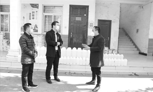2月16日,杭州沈丘商会筹备组负责人、河南晟衡建筑劳务有限公司董事长段金峰驱车从郑州赶回沈丘,向县委统战部、县工商联送去了600公斤84消毒液,助力家乡疫情防控。记者 王艳 摄