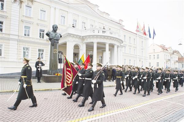 2月16日,在立陶宛首都维尔纽斯,仪仗队参加独立日庆祝活动。