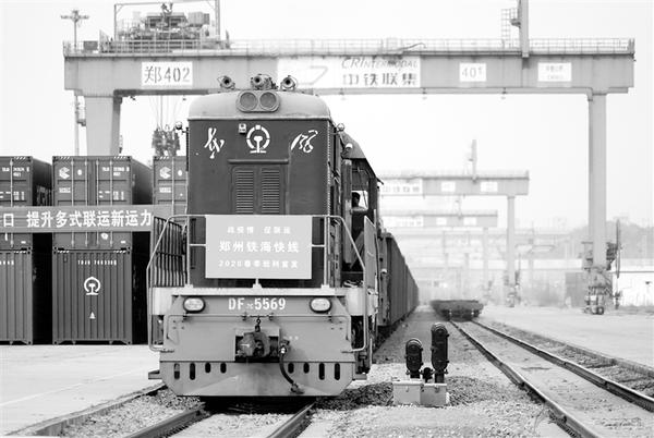 2月19日,45007次铁海快线班列停靠在中铁联集郑州中心站等候发车。当日,45007次铁海快线班列搭载35组集装箱从中铁联集郑州中心站发车,驶往山东青岛港,这是春节后郑州发出的首趟铁海快线班列。新华社记者 李安 摄