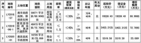 七、挂牌时间及网址:挂牌报价时间为:LY2018-57地块: 2020年3月17日9时至 2020年3月26日15时。LY2019-96-1地块:2020年3月17日9时至2020年3月26日15时10分。LY2020-01地块:2020年3月17日9时至 2020年3月26日15时20分。挂牌网址:鹿邑县公共资源交易平台(http://www.lyggzyjy.org.cn/)。