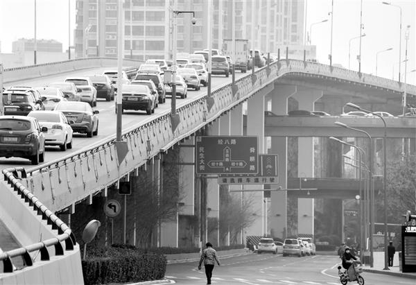 2月24日,车辆缓行在济南顺河高架路上。 当日,山东济南出现“早高峰”,车流增大,部分交通节点缓行。目前,济南市已进入全面复工期,规模以上工业企业开工率达98.2%。