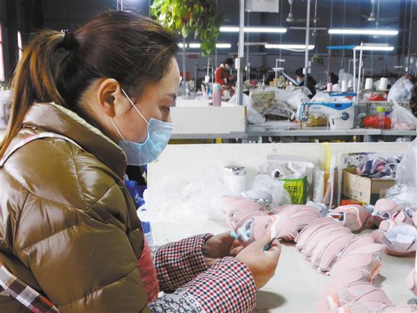 3月2日,沈丘县付井镇岗王村一家童鞋加工厂,工人忙着加工鞋帮。连日来,为加快各行各业复工复产,该县千方百计抢时间、补损失、抓生产,全面按下“快进键”。“我们村的防疫工作做得好,现在童鞋厂恢复生产了,不出村就能打工,像我这做得比较熟练的每月都能拿到4000多元。既能挣钱,又不耽误料理家务和照顾孩子,真得劲!”当日,村民孙丽杰兴奋地说。