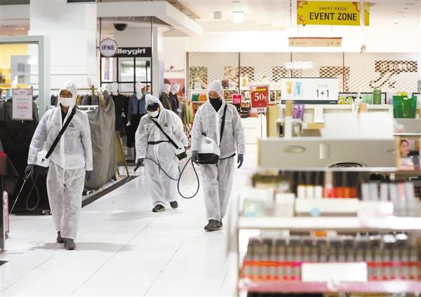 3月2日,在韩国首尔,某百货商店的工作人员进行防疫消毒。