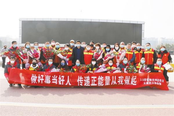 3月5日是学雷锋日。当日,太康县志愿者协会、太康县好人协会开展了向一线医护人员送鲜花、给市民免费理发、为疫情防控捐款等活动,用行动传承雷锋精神。图为参加活动的志愿者合影留念。