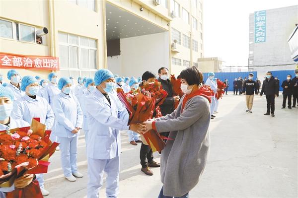 本报讯 (记者 徐松 文/图) 3月3日9时30分,随着最后一名新冠肺炎患者韩某英的身体各项检测指标达到出院标准,郸城所有新冠肺炎患者全部治愈出院。至此,该县新冠肺炎患者清零。县委副书记、政法委书记崔卫国,副县长肖炜,县卫健委、县人民医院、县中医院相关负责同志和专家组成员参加新冠肺炎患者出院仪式。崔卫国代表县委、县政府向广大医务工作者表示感谢,向出院人员表示祝贺。