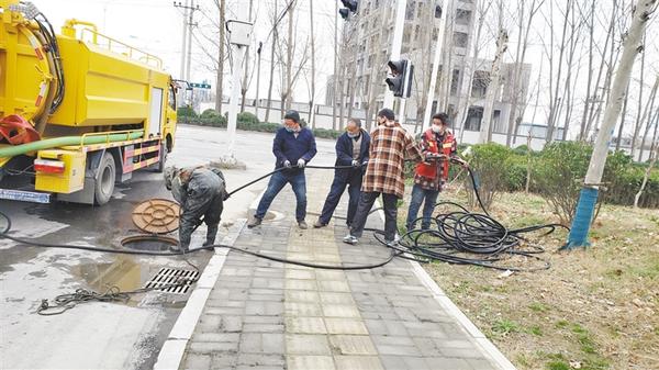 开发区公用事业管理中心按照精细化管理要求,组织市政设施维护人员定期对路网、行道树进行巡查,及时更换雨污水井盖及雨水箅,修剪行道树。图为3月9日,开发区公用事业管理中心对辖区朝阳路市政设施加紧维护,及时疏通排水管道,消除道路积水隐患。