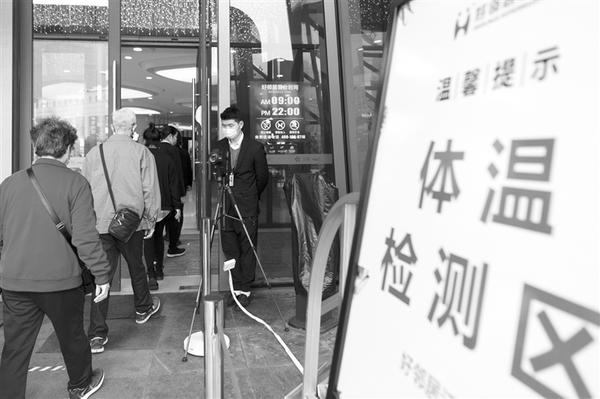 3月25日,在襄阳市樊城区一超市入口,市民通过体温检测区。