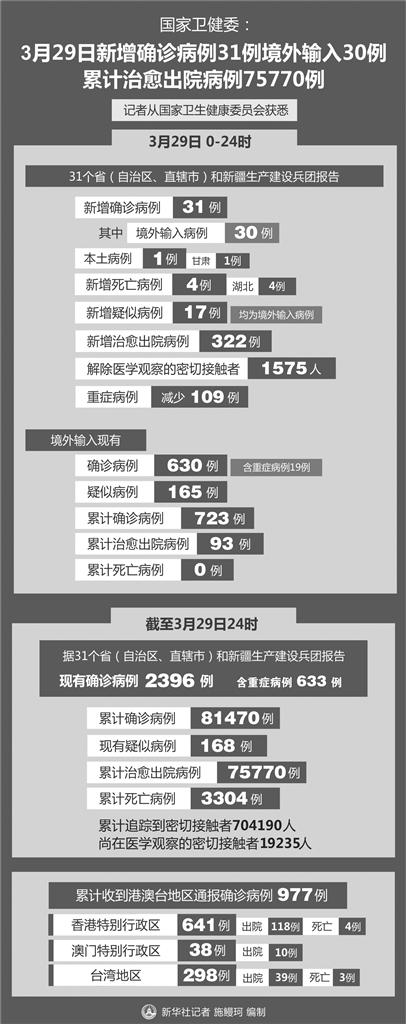 国家卫健委:3月29日新增确诊病例31例 境外输入30例 累计治愈出院病例75770例