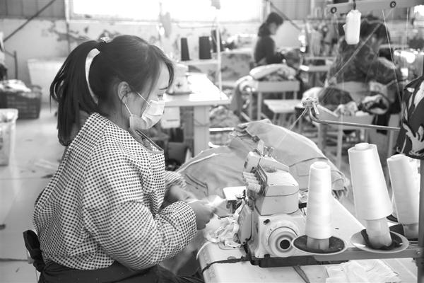 4月7日,在项城市孙店镇石营村一家制作服饰的扶贫车间内,工人在赶制订单。为克服疫情对扶贫车间和带贫企业的影响,项城市采取免除所有扶贫车间一个季度的租金和带贫基地一个季度的水电费用,使全市52个扶贫车间和2个带贫基地全部迅速复工复产,确保贫困群众稳就业、能增收。张永久 摄