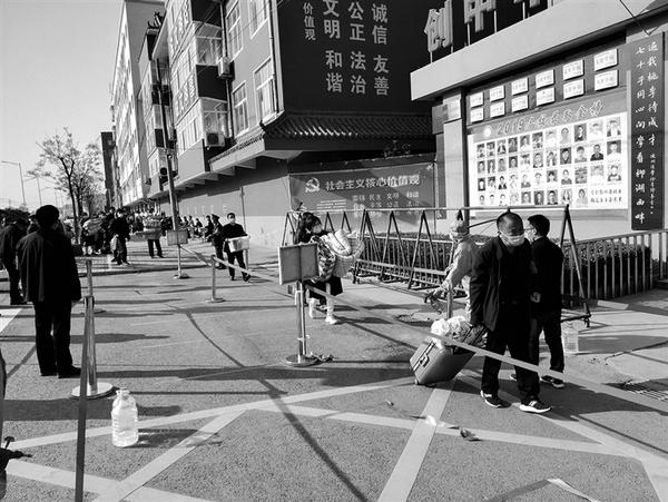 与此同时,在淮阳中学,由于家长禁止进入校园,学校领导和高三教师组成30多人的志愿者队伍,“客串”家长,帮学生拎行李。学校入口处,铺有消毒通道,每位学生都要从这里通行,并实名登记、测量体温。为防止消毒液蒸发失效,两名工作人员背着喷雾器,不停对通道喷洒药液。