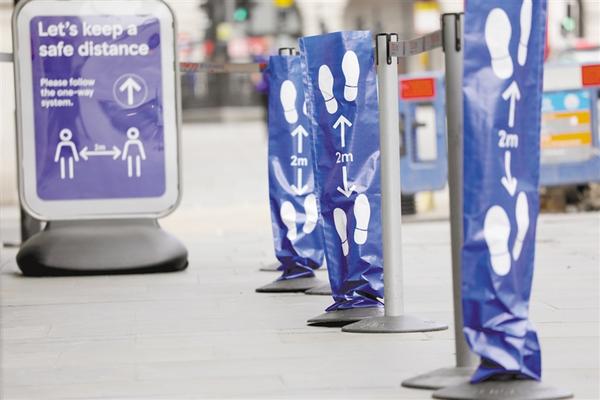 这是4月8日在英国伦敦一家超市门外拍摄的提醒人们保持安全距离的参照物。受新冠疫情影响,英国伦敦很多公共场所都采取措施引导民众保持“社交距离”。新华社发