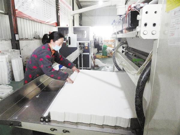 4月13日,商水县黄寨镇曾楼村一贫困群众正在村里的扶贫车间紧张工作。据了解,该扶贫车间共安排26名贫困群众就业,生产的抽纸供不应求。目前,该县96个扶贫车间在做好防疫的同时已全部复工复产,共安排5000多名贫困群众就地就近就业,实现脱贫致富。