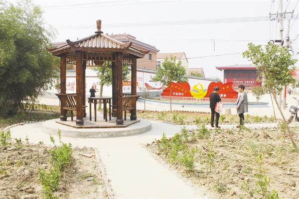 4月18日,在孙店镇陈州张行政村南北大街,古色古香的凉亭矗立在游园中心,与正在建设的水上公园,构成了一幅生态秀美的乡村图画。记者 杨光林 摄