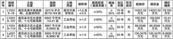 LY2019-76地块: 2020年5月21日9时 至 2020年6月2日15时。LY2019-107地块: 2020年5月21日9时 至 2020年6月2日15时10分。LY2019-110地块: 2020年5月21日9时 至 2020年6月2日15时20分。LY2019-111地块: 2020年5月21日9时 至 2020年6月2日15时30分。挂牌网址:鹿邑县公共资源交易平台(http://www.lyggzyjy.org.cn/)。