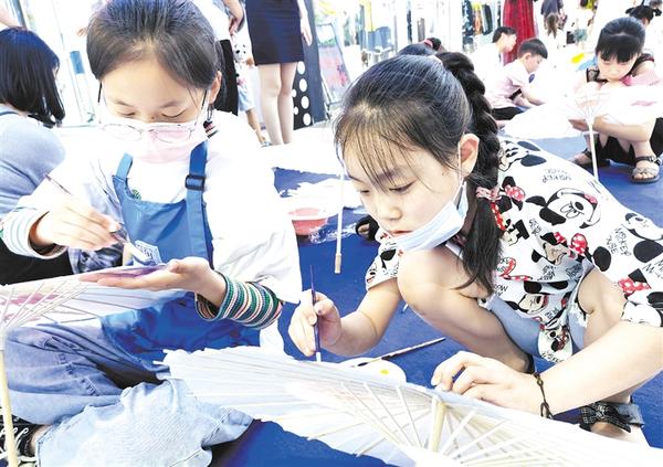 “六一”国际儿童节前夕,我市社会各界采取多种形式,丰富少年儿童业余文化生活。图为在中心城区五一文化广场举行的雨伞彩绘活动中,孩子们席地而坐,认真绘画。