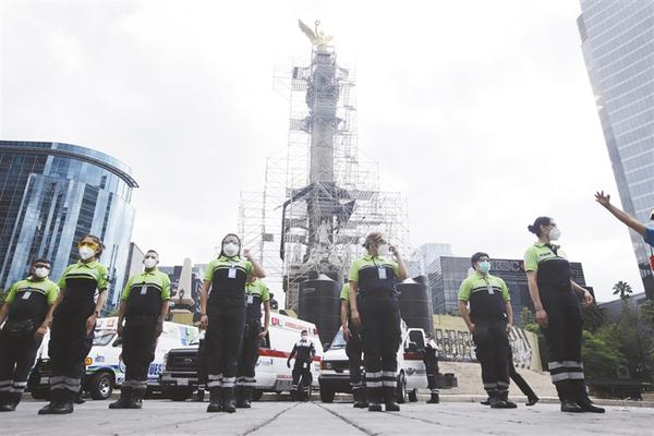 5月30日,在墨西哥首都墨西哥城,医务人员参加纪念活动。当日,来自墨西哥城多家医院的医务人员在墨西哥城著名的改革大道举行活动,纪念在此次新冠疫情中逝去的同行。新华社发