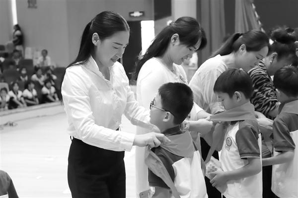 5月30日,周口天立学校小学部有一批学生加入了中国少年先锋队。新队员的家长上台为自己的孩子佩戴红领巾,并赠送礼物及寄语。戴着鲜艳的红领巾,该校一(1)班学生程诺代表新队员发言,表达了无比自豪的心声。 记者 刘华志 通讯员 王春英 摄