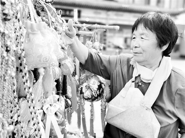 6月4日,吕大妈在悬挂刚做好的香包。端午节临近,我市城区大街小巷,各种形象生动、精致可人的香包深受市民喜爱。