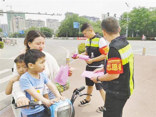 在项城市“一盔一带”主题宣传活动中,该市汽摩协会组织20名志愿者配合项城市公安局交警大队民警开展宣传活动。