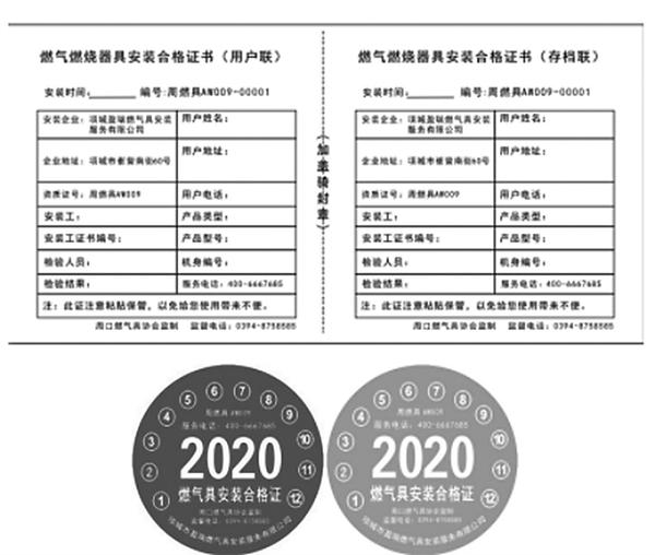 三、安装维修委托流程:燃气具生产厂家或燃气具品牌销售企业向燃气燃烧器具安装维修企业提出书面申请,签订安装维修委托协议。委托方向被委托方提交《燃气具安装维修申请单》,被委托方接到委托方《燃气具安装维修申请单》后,提供有偿的安装维修服务项目并出具《燃气燃烧器具安装维修合格证书》及收据,证书图样如图。