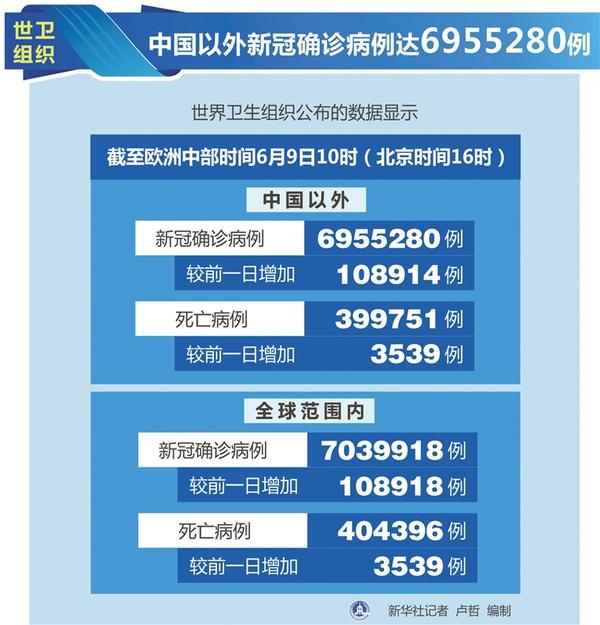 世卫组织:中国以外新冠确诊病例达6955280例