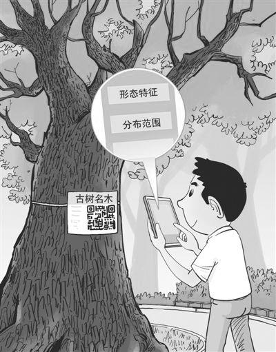 古树名木是不可再生的自然遗产,也是一个地方的绿色名片。不久前,山东省泰安市建成区为辖区内152株古树名木设计了带有二维码的新保护牌。市民通过扫码就可以一目了然地看到保护级别、形态特征等信息,在普及相关知识的同时,有助于增强市民保护古树的自觉意识。这正是:
