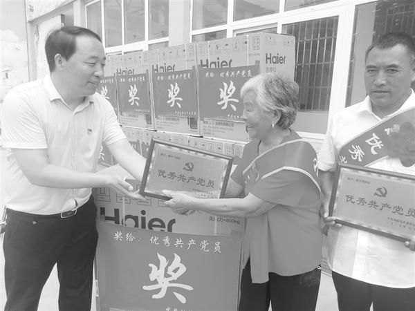 6月30日,淮阳区刘振屯乡耿楼村老党员程守兰等被授予“优秀共产党员”荣誉称号。当天,该乡共有35名来自不同战线的优秀共产党员获表彰,每人获一台洗衣机奖励。在中国共产党99周年华诞之际,周口多个乡镇隆重表彰在疫情防控、农村人居环境整治等工作中表现突出的共产党员,进一步激励基层广大党员,坚定信心,振奋精神,凝心聚力决战脱贫攻坚、决胜全面小康。记者 侯俊豫 摄