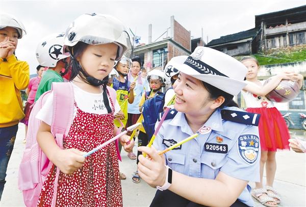 7月11日,一名交警正在给小朋友赠送带有交通标志的铅笔。当日,广西柳州市交警支队的民警来到融水苗族自治县大浪镇大新村红邓屯教学点,开展暑期交通安全教育活动,增强孩子的安全出行意识。新华社记者 黄孝邦 摄