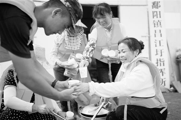 7月11日,在鄱阳镇江家岭村,“阿姨团”队长余风英(右一)给武警战士盛绿豆汤。 Ⅲ级,Ⅱ级,Ⅰ级,短短三天,江西省防汛应急响应级别一再提升,多条河流及鄱阳湖沿岸地区防汛压力持续增大。在政府的组织号召下,党员干部、武警官兵及其他社会力量积极投入到防汛抗洪工作中。在江西省鄱阳县鄱阳镇江家岭村,还有一支防汛队伍——由中老年妇女组成的“阿姨团”。新华社发