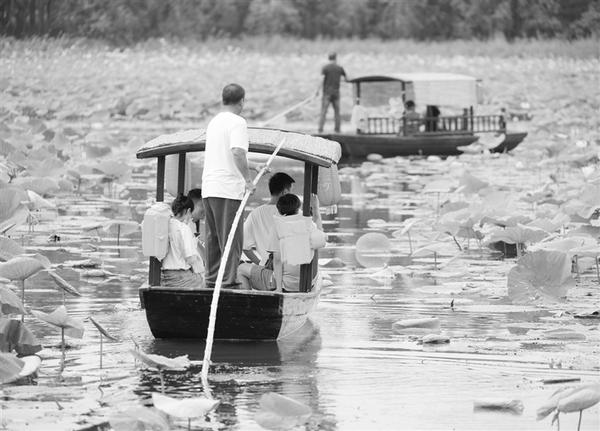 7月13日,游客乘船在莲花湖湿地公园内观赏荷花。近日,辽宁省铁岭市莲花湖湿地公园内成片的荷花竞相开放,游客乘船行进其中,美不胜收。新华社记者 杨青 摄