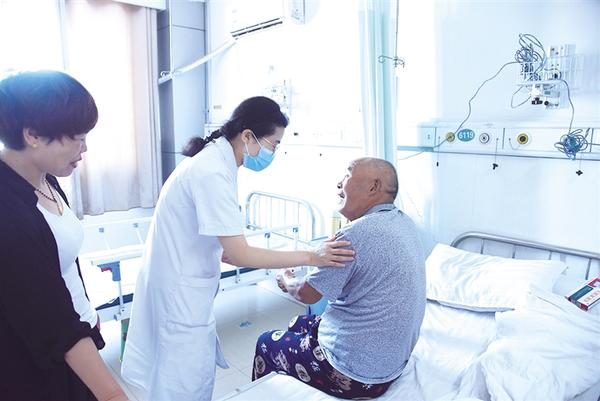 该院全科医学科科主任王晓宁为赵老先生制订了个性化治疗方案,鼓励他积极治疗。期间,王晓宁严密监测他的病情,每次查房都对他关怀备至,耐心为他讲解治疗的进展及生活方面的注意事项,护理人员悉心照顾、耐心开导,像对待亲人一样认真护理(如图)。赵老先生高兴地说:“我来的时候很悲观,以为要瘫了。幸好有王晓宁主任,小王、小段、小周、小顾(注:全科医学科护士王珍、段萌萌、周玲玲、顾问问),真是太感谢你们了。”