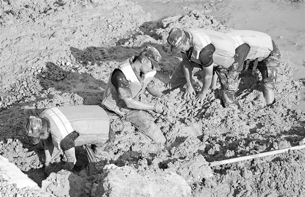 武警江西总队上饶支队的官兵在处置一处堤坝坍塌险情(7月14日摄)。