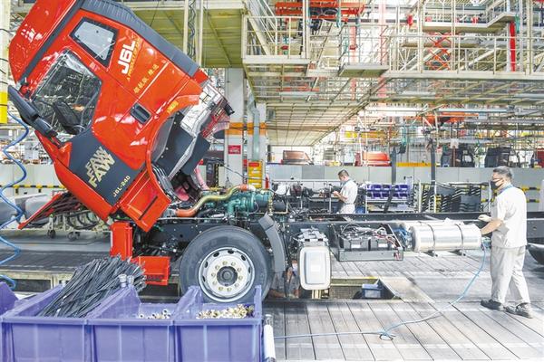 在位于长春的一汽解放总装车间,工人正在装配车辆(6月19日摄)。7月27日,国家统计局发布数据,6月份,全国规模以上工业企业实现利润总额6665.5亿元,同比增长11.5%,增速比5月份加快5.5个百分点。新华社记者 张楠 摄