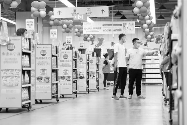 7月28日,顾客在扶贫超市内选购商品。当日,以销售扶贫产品为特色的首农物美扶贫超市在北京市消费扶贫双创中心开业。据介绍,超市内设置扶贫商品专柜面积1200平方米,主要销售包括北京市扶贫支援的7省区90个县级地区在内的扶贫产品近1000种。新华社发