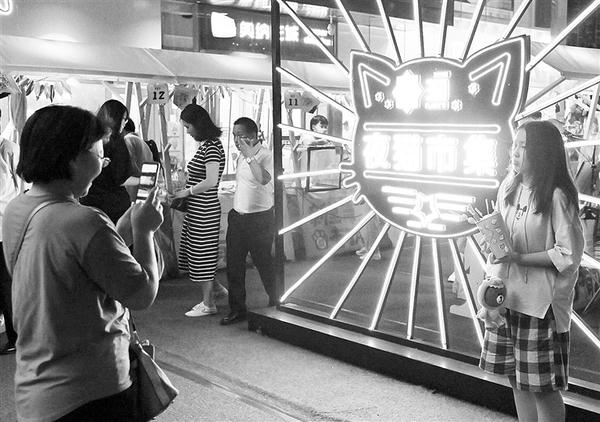 在“夜猫市集”入口处,人们在拍照留念(7月29日摄)。