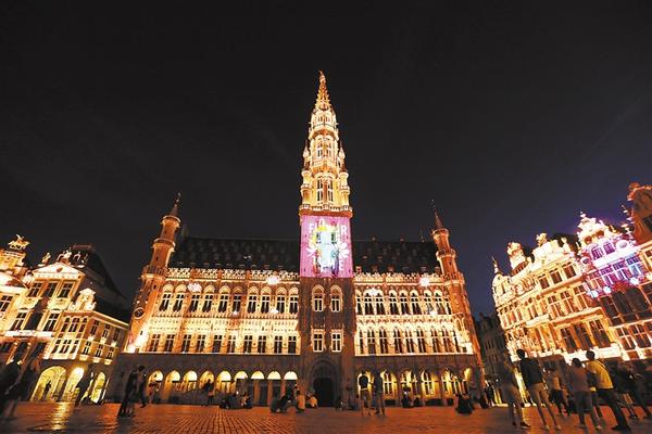 7月29日,人们在比利时布鲁塞尔大广场欣赏声光秀,市政厅外墙上投射出“鲜花时光”的字样。7月29日,比利时布鲁塞尔大广场举行大型声光秀。艺术家在市政厅等历史建筑上投影文字和图案,纪念这个夏天受新冠疫情影响而不能如期举办的文化活动。新华社记者 郑焕松 摄