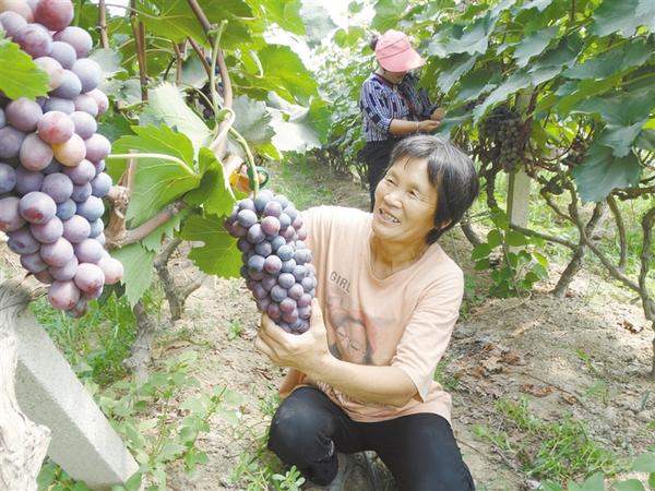 8月4日,在沈丘县周营镇东李营村一处大棚生态葡萄种植基地,果农忙着采摘成熟的订单葡萄。近年来,该镇以农业供给侧结构性改革为契机,发挥资源优势,出台优惠政策,规模流转土地,发展订单大樱桃、猕猴桃、冬桃、冬枣及中药材等特色现代生态农业,经济效益可观。记者 韦伟 摄