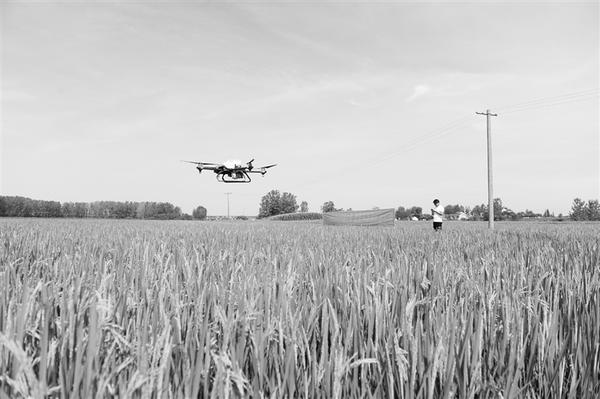 8月4日,在肥东县店埠镇,农业科技公司的技术人员杨汉林操作无人机喷洒农药。受汛情影响,安徽省肥东县部分乡镇发生洪涝灾害,农业生产受到影响。为降低损失,当地乡镇在积极防汛的同时开展生产自救。新华社记者 黄博涵 摄