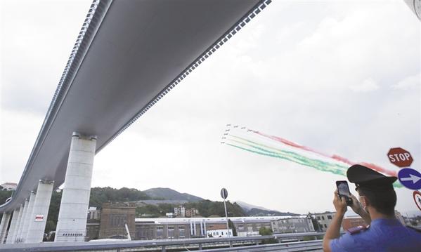 8月3日,在意大利热那亚,意大利“三色箭”飞行表演队飞过重新建成的圣乔治大桥。在发生导致43人死亡的垮塌事故近两年后,意大利北部热那亚一座重新建成的大桥3日投入使用。新桥命名为圣乔治大桥,由出生于热那亚的意大利著名建筑师伦佐·皮亚诺设计。新华社发