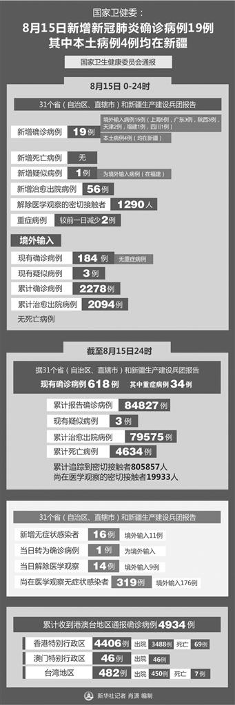 8月15日新增新冠肺炎确诊病例19例 其中本土病例4例均在新疆