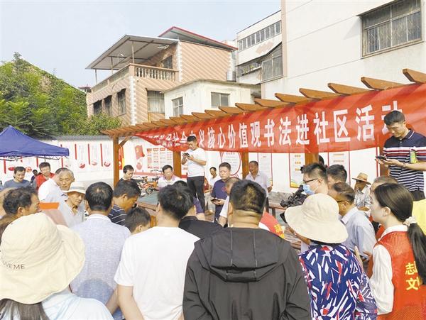 9月13日上午,由川汇区委宣传部、川汇区文联联合举办的弘扬社会主义核心价值观书法进社区活动在金海路办事处朱庄社区文化服务广场举行。活动现场,区书协的书法家泼墨挥毫,把社会主义核心价值观与优秀传统文化有机融合,写出一幅幅书法作品,并免费赠送给现场群众。 记者 韩志刚 通讯员 刘小巍 摄