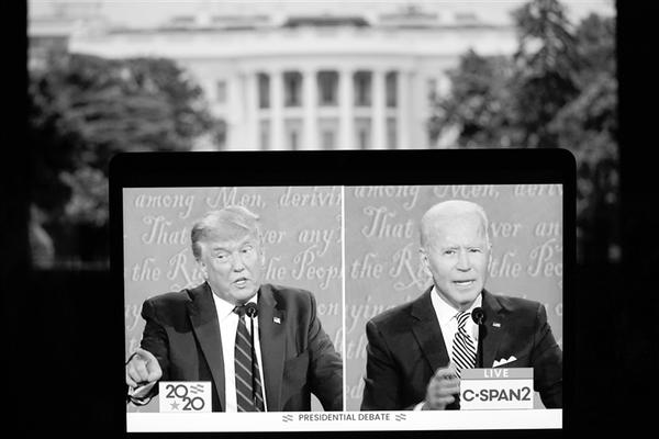 这张9月29日在美国弗吉尼亚州阿灵顿拍摄的视频画面显示,美国总统特朗普(左)与美国民主党总统候选人拜登在俄亥俄州克利夫兰市参加2020年美国总统候选人首场电视辩论。谋求连任的美国总统特朗普与民主党总统候选人拜登于美国东部时间29日晚进行了首场电视辩论,就新冠疫情、经济、选举公正性、城市种族和暴力等六大议题展开交锋。约90分钟时间里,两人频频打断对方并在言语上互相攻击,主持人多次调停争吵,维持秩序。新华社记者 刘杰 摄