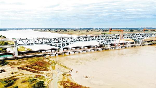 由中铁大桥局承建的国家重点工程——郑(州)济(南)铁路郑州黄河特大桥主桥已进入最后的桥面系铺设建设阶段。郑济铁路郑州黄河特大桥主桥全长2016米,采用公路、铁路上下层合建的布置形式,设计4线铁路、6车道快速公路。