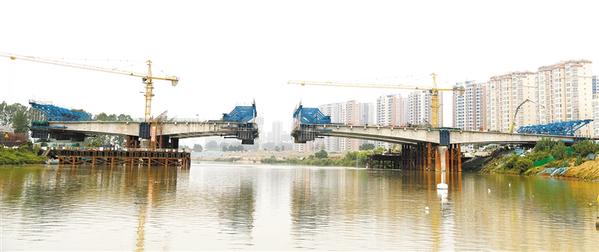 昨天,记者在中原路跨沙颍河桥施工现场看到, 中原路跨沙颍河桥即将合龙。目前,桥体剩下两段桥体未建成,分别是跨河南桥墩两侧的桥体,预计需要一个月时间。