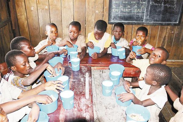 ① 2019年10月17日,在贝宁经济首都科托努郊区的托优优美小学,学生们在午餐时享用中国援助的米饭。