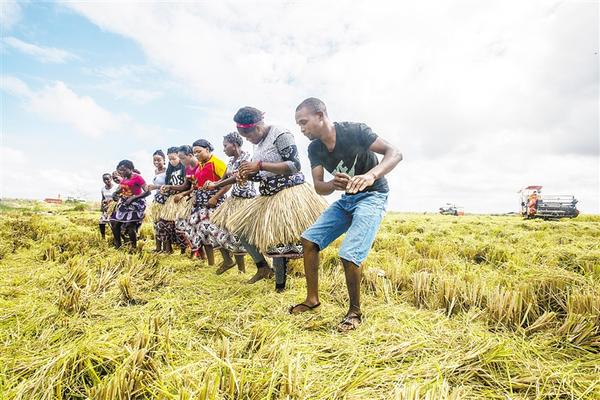 ② 2019年4月7日,在莫桑比克万宝莫桑农业园,农户在水稻收割现场载歌载舞庆祝丰收。