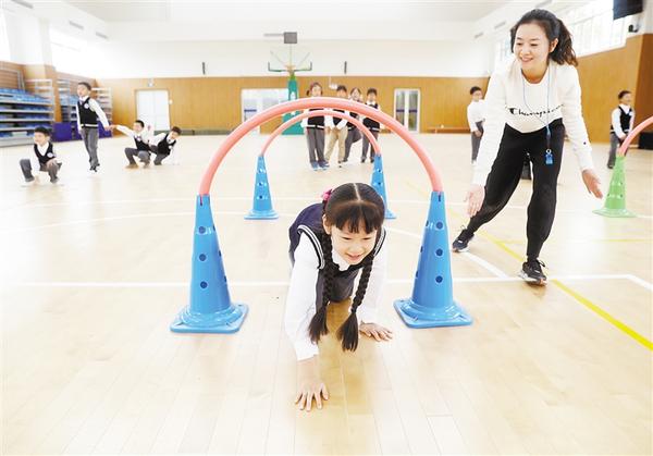 10月16日,一年级4班的学生在体育课上参加创意游戏。当日,复旦大学附属徐汇实验学校为一年级“萌娃”们安排了一堂内容丰富的体育课。体育老师用沙包、塑料桩等工具设计创意游戏,带领小朋友们感受运动的乐趣。新华社发